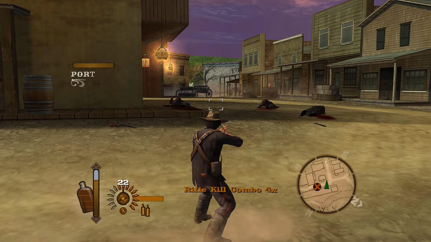 It doesn't get old because missions end before it can, and eventually so does the game. It's 100% a game from its era in the best way. It's not interested in padding out its run time or piling on systems upon systems; it just wants you to run around and shoot bad guys in the Old West.